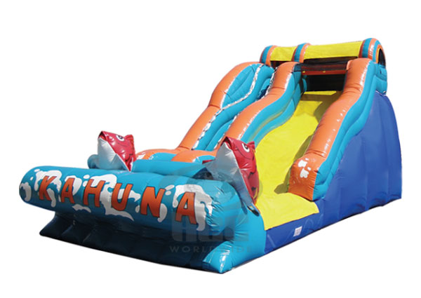 Make a big splash with our Big Kahuna 19 feet tall inflated dry slide! Our dry slide rental customers rate this as our best slide! This dry slide features a bump in the slide lane, easy climb stairway to the top of the slide and sweet sliding lane down to the inflated landing between two giant fish. Yea, it's cool and will be the big hit for all your party needs, book early for the best selection for all your party rental needs, big or small. Our dry slide customers love this slide when setup on concrete as the inflated bed keeps you safe from the hard surface below! We provide clean, on-time dry slide rentals for our customers. Looking for the best in inflatable rentals? Let us help make your next event the BEST EVENT EVER! Looking for something wet instead? Check out our water slides!