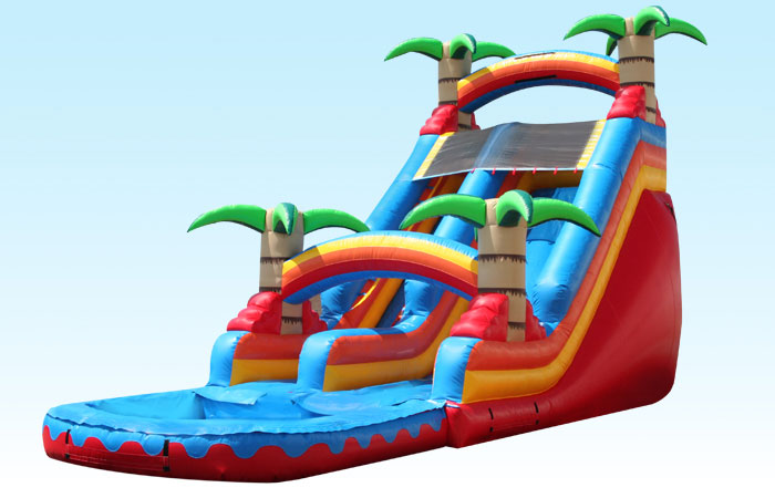 Our 20' Tropical Dry Slide is the perfect addition to your next summer party! Our dry slide rental customers think this one is a fan favorite! The vibrant colors of orange, yellow and blue pop along with the attention grabbing palm trees. This slide is great for kids or adults. A perfect addition to your next event to cool off on a hot day! Our dry slide rental customers agree! We provide clean, on-time dry slide rentals for our customers. Looking for the best in inflatable rentals? Let us help make your next event the BEST EVENT EVER! Looking for something wet instead? Check out our water slides!